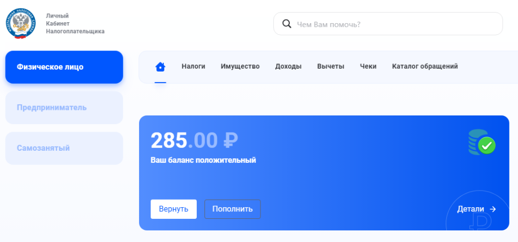 ФНС предлагает пользователю получить информацию о наличии задолженностей по налогам, о переплатах и текущих налоговых начислениях. Данная информация размещена в «Личном кабинете налогоплательщика», который доступен физическим и юридическим лицам, а также ИП.