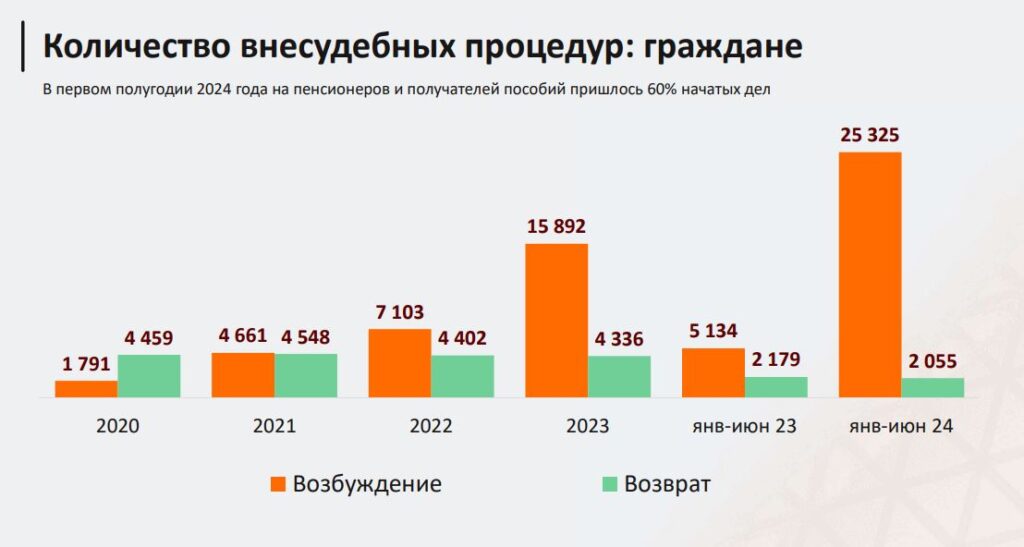 Так, только за январь-июнь 2024 года было запущено 25,3 тыс. дел, что в пять раз больше, чем за тот же период годом ранее. С конца 2023 года к процедуре допустили пенсионеров и тех, кто получает социальные пособия – на них за первые шесть месяцев 2024 года пришлось более 60% начатых дел.