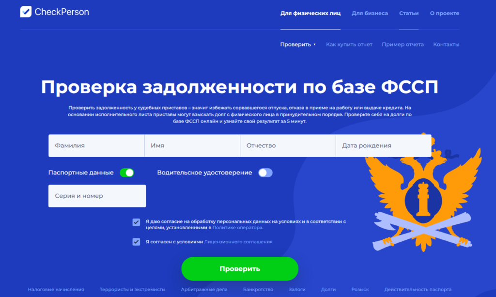 С помощью сайта CheckPerson можно за 5 минут получить официальные сведения из государственных и коммерческих баз данных. При этом сервис позволяет провести комплексную проверку, а не только узнать долг по алиментам.
