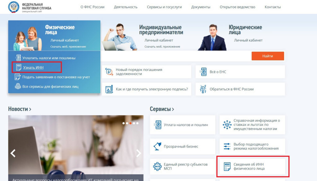Перейти на сервис поиска ИНН можно с главной страницы либо через раздел «Физические лица», либо по кнопке «Сведения об ИНН физического лица».