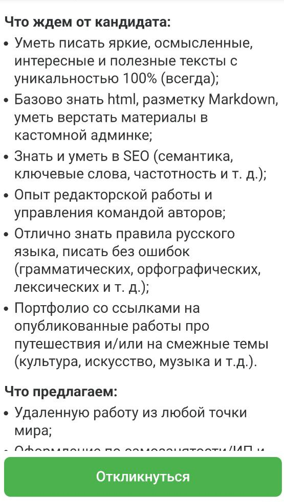 Не стоит копировать в текст вакансии должностную инструкцию целиком: слишком большой и подробный список отпугнет кандидатов. В идеале нужно перечислить повседневные задачи, которые надо будет исполнять — эту информацию для текста вакансии можно уточнить у будущего непосредственного руководителя сотрудника.